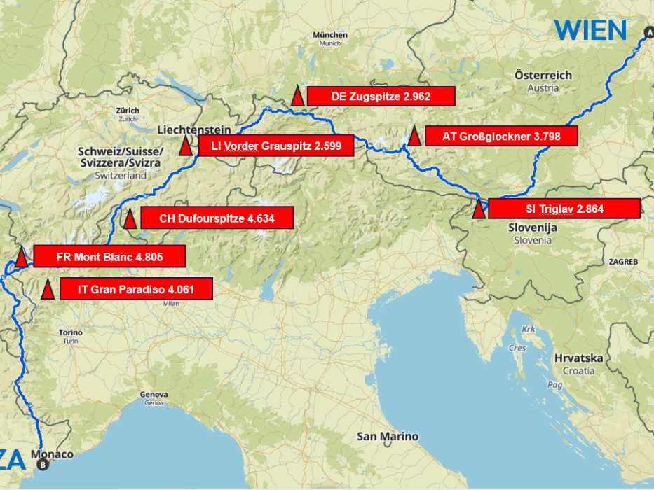 Es ist der erste durchgehend dokumentierte Versuch, die sieben höchsten Gipfel der sieben Alpenländer in einer rein fußläufigen, self-supported Durchquerung von Wien nach Nizza zu verbinden.